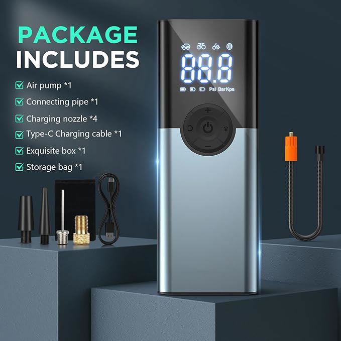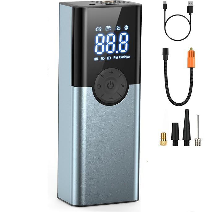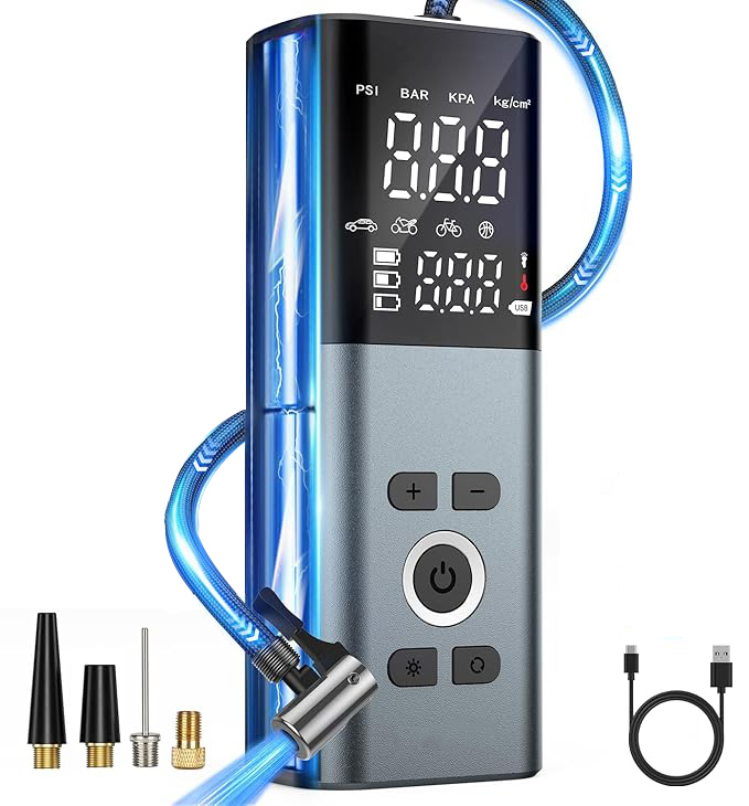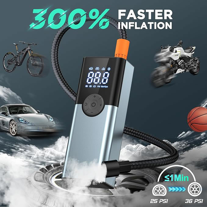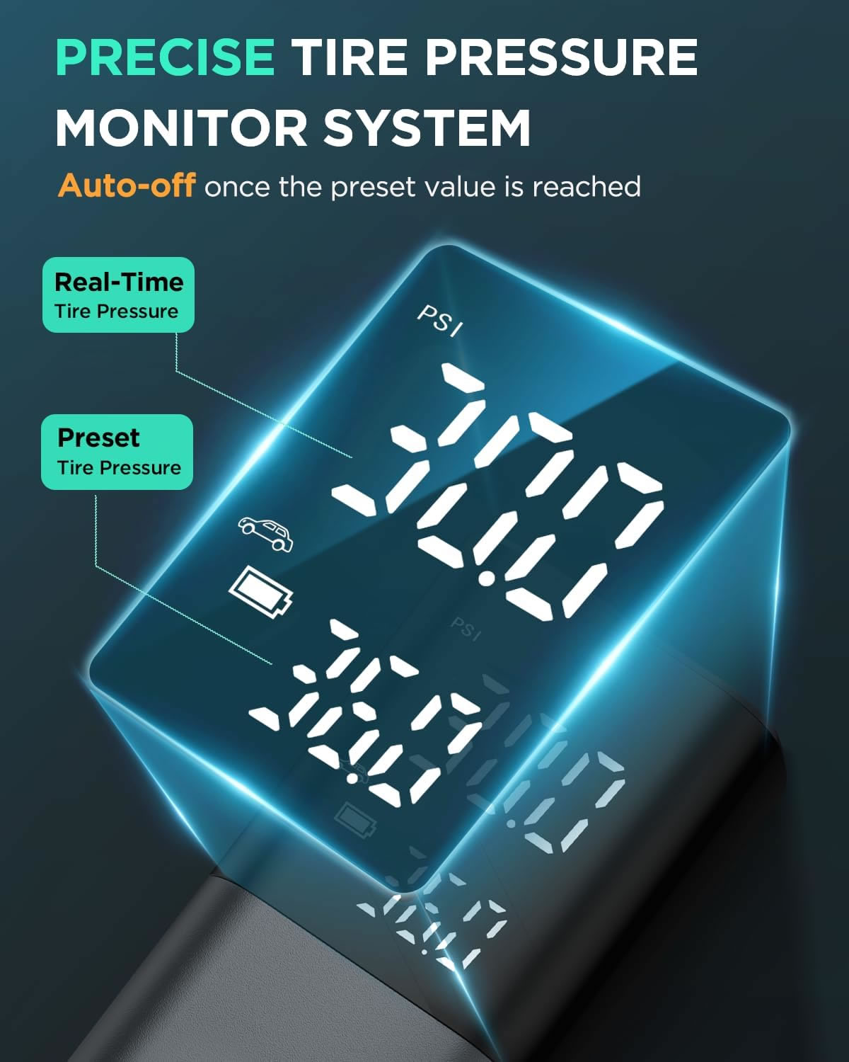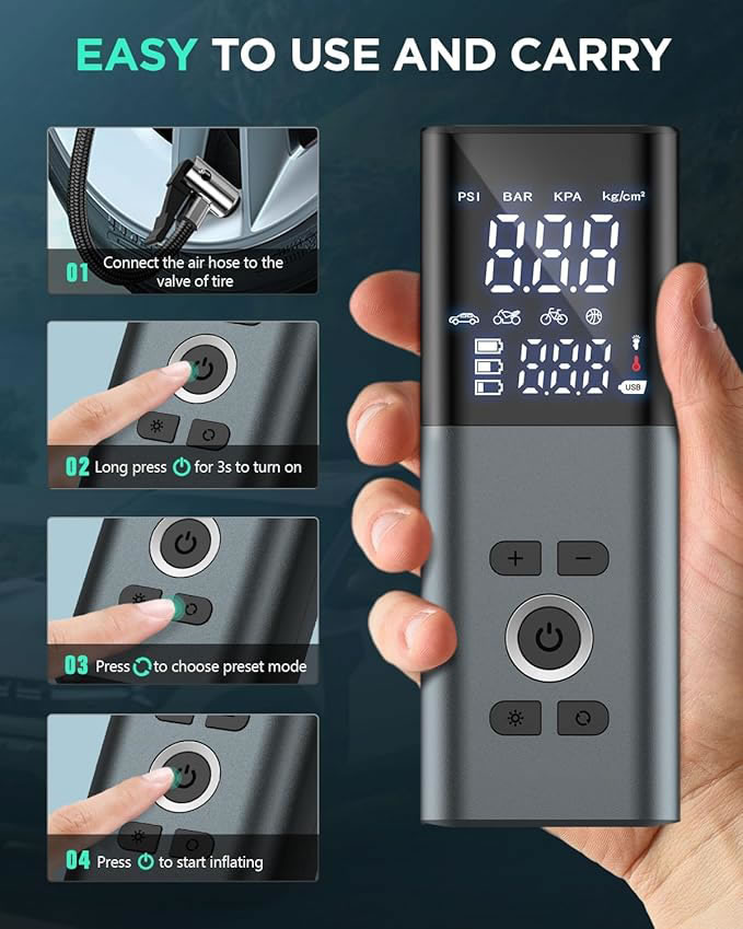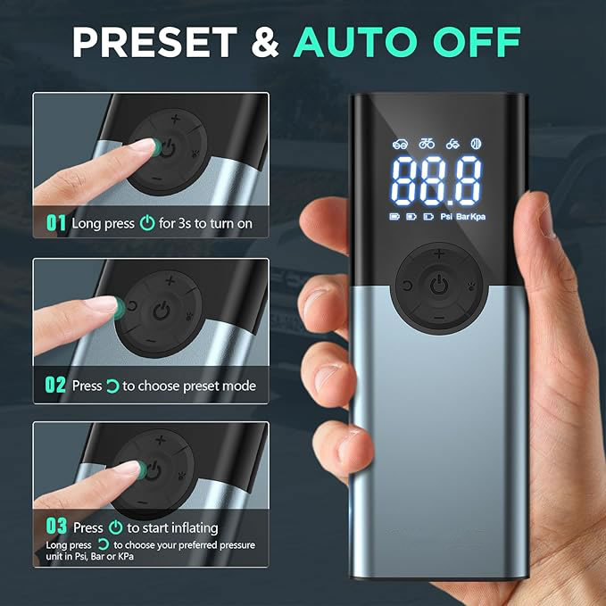 This portable air compressor offers fast, cordless inflation for car tires, motorcycles, bikes, and sports equipment. It features four intuitive preset modes and a manual mode for custom pressure settings up to 150 PSI. The large LED display shows real-time pressure, and the pump automatically shuts off when the target is reached. Its built-in battery and compact design, complete with a storage bag, make it an ideal and reliable tool for travel, daily use, and emergencies.