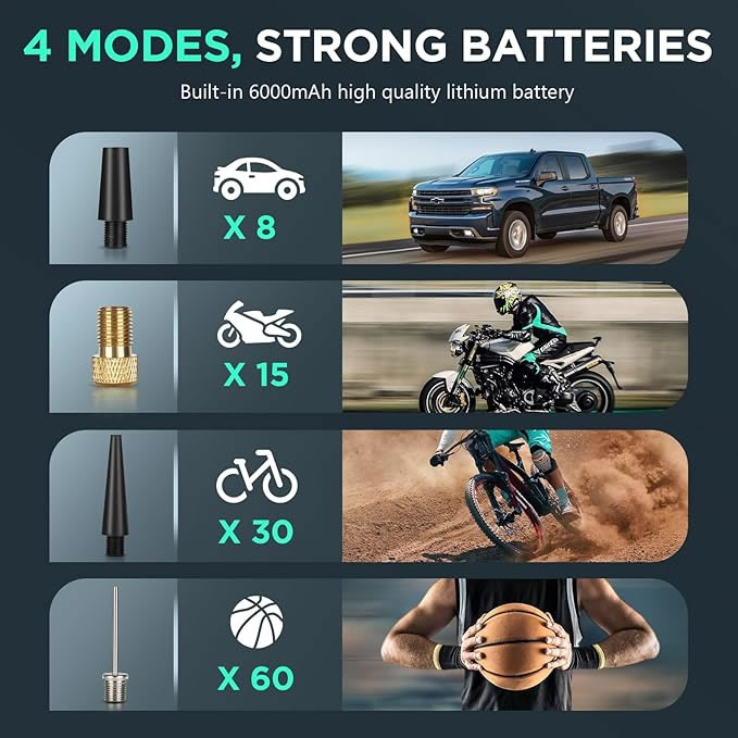 4 Preset Modes: Car (26-51PSI), Motorcycle (26-44PSI), Bicycle (30-150PSI), and Ball (4-16PSI).